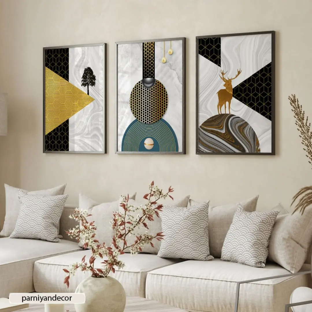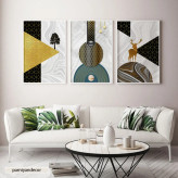 تابلو دکوراتیو ست سه تکه مدرن با اشکال هندسی مثلث، دایره، نیم دایره، گوزن، درخت و المان های هلالی موازی.