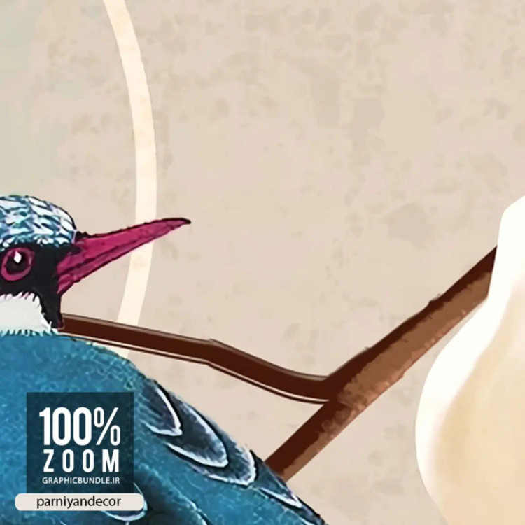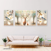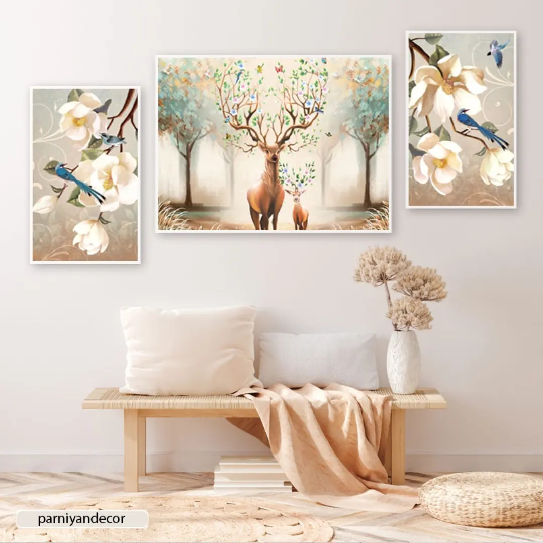 تابلو دکوراتیو ست سه تکه متقارن هنری با طرح های گرافیکی از نقاشی شکوفه درخت، پرنده، گوزن و درخت