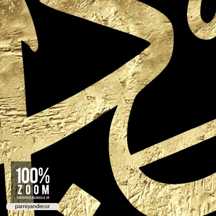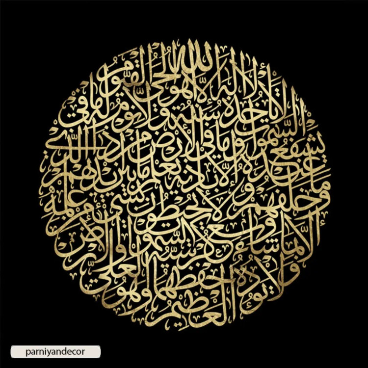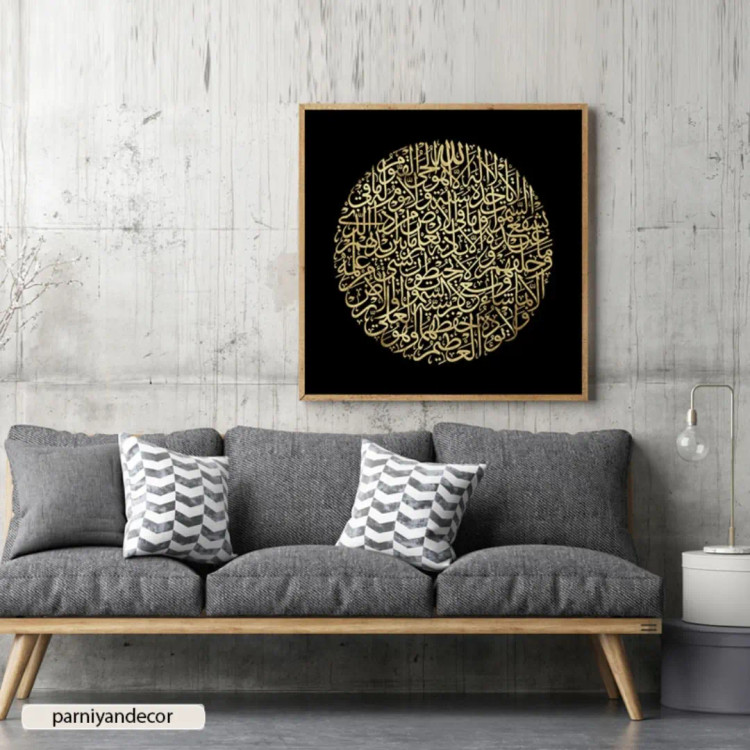 چاپ تابلو دکوراتیو مربعی مذهبی با خطاطی ثلث (خوشنویسی) با رنگ طلایی و پس زمینه سیاه. نوع تابلو: چاپ پارچه بوم درجه یک.