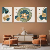 تابلو دکوراتیو با المان های برگ طلایی دایره ای نیلوفر، ماهی، حلقه و گوی طلایی. نوع تابلو: چاپ پارچه بوم درجه یک با قاب چوب روسی. ابعاد تابلو اصلی ۱۰۰ در 70 و تابلوهای کناری ۵۰ در ۷۰. هدیهای ماندگار برای عزیزان.
