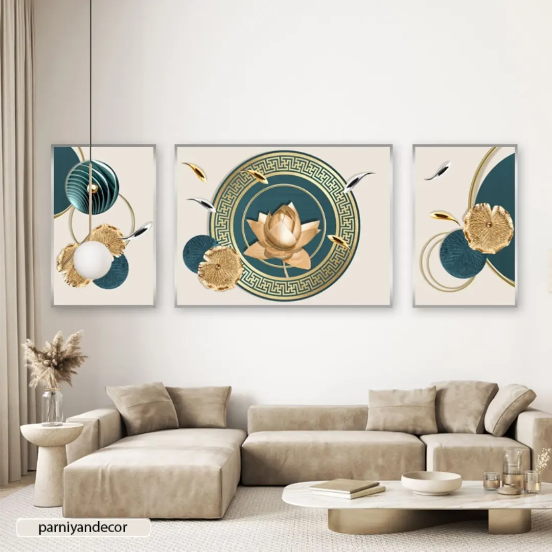 تابلو دکوراتیو با المان های برگ طلایی دایره ای نیلوفر، ماهی، حلقه و گوی طلایی. نوع تابلو: چاپ پارچه بوم درجه یک با قاب چوب روسی. ابعاد تابلو اصلی ۱۰۰ در 70 و تابلوهای کناری ۵۰ در ۷۰. هدیهای ماندگار برای عزیزان.