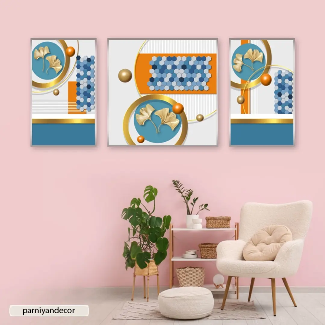 تابلو دکوراتیو ست سه تکه مدرن با اشکال هندسی شش ضلعی و دایره، گوی طلایی و برگ های بادبزنی. ابعاد تابلو اصلی ۱۰۰ در 70 و تابلوهای کناری ۱۰۰ در ۵۰. نوع تابلو: چاپ پارچه بوم درجه یک. قاب تابلو: چوب روسی با ضخامت ۵ سانت.