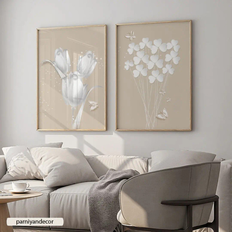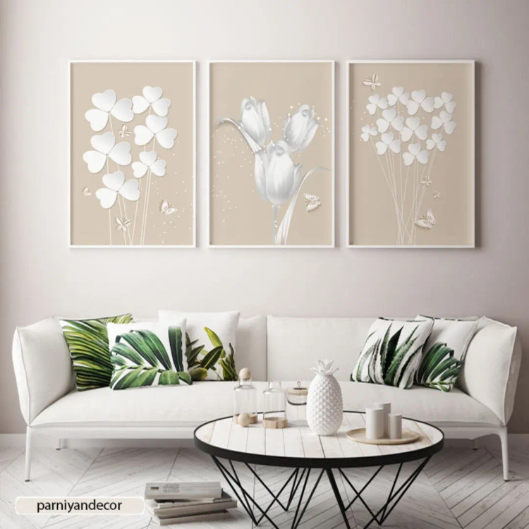 تابلو دکوراتیو ست سه تکه با طرح گل های سفید و پروانه