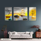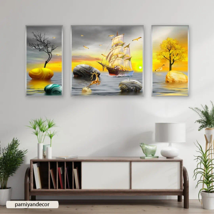 تابلو دکوراتیو ست سه تکه متقارن منظره با طرح های سنگ های رنگی، گوزن طلایی، کشتی بادبانی، دریا، مرغان دریایی