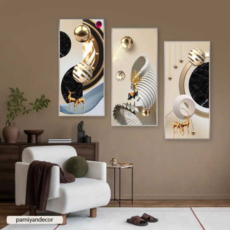 تابلو دکوراتیو ست سه تکه مدرن با المان های هندسی کروی و گوزن طلایی.