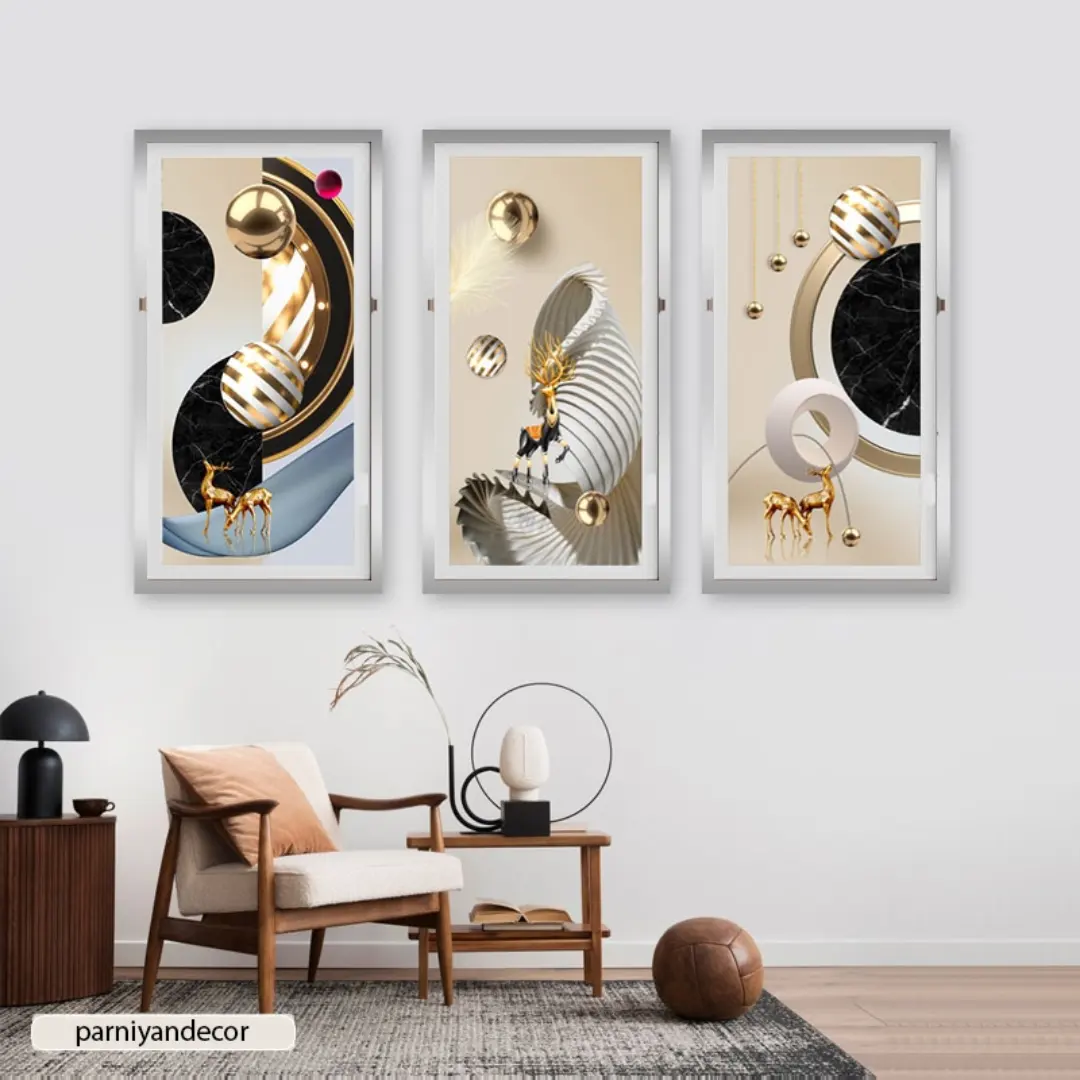 تابلو دکوراتیو ست سه تکه مدرن با المان های هندسی کروی و گوزن طلایی.