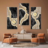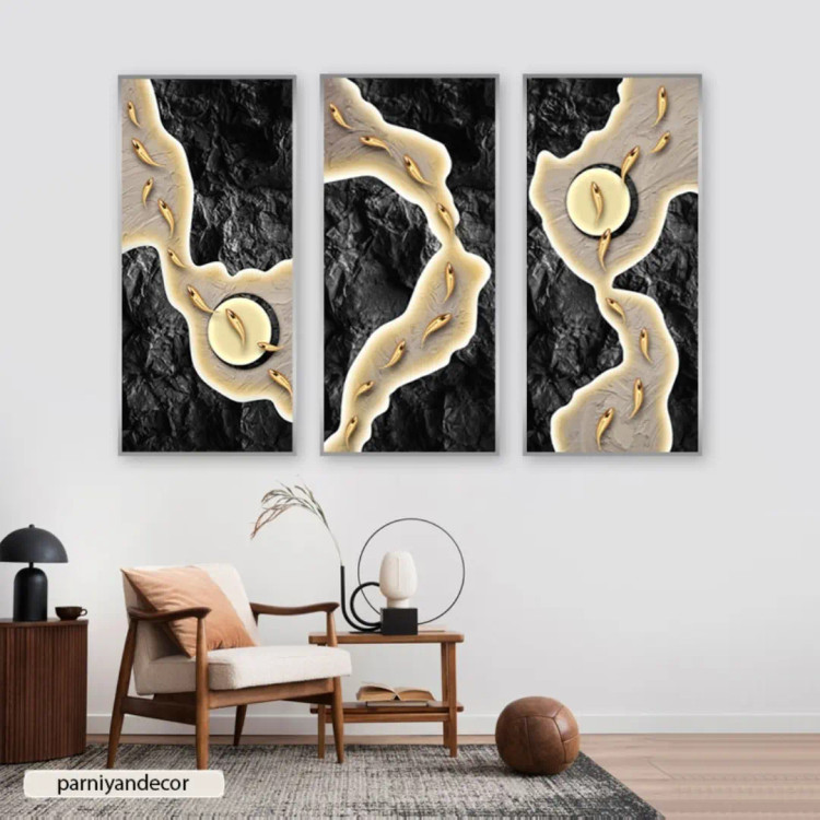 ست سه تکه تابلو دکوراتیو طرح پس زمینه سنگ سیاه و ماهیهای طلایی