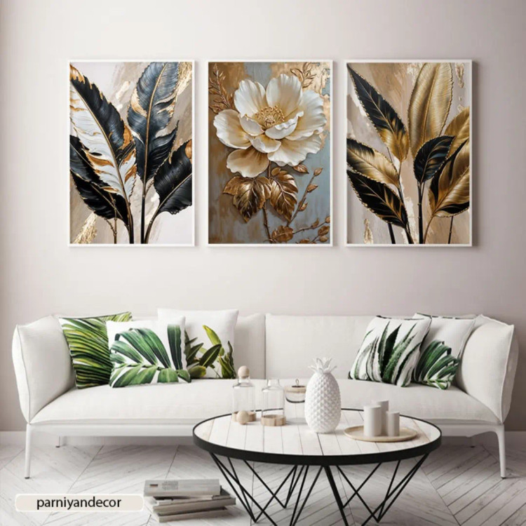 تابلو دکوراتیو ست سه تکه لوکس طلایی با طرح برگهای برجسته طلایی و گل برجسته. نوع تابلو: چاپ پارچه بوم درجه یک. قاب تابلو: چوب روسی با ضخامت ۵ سانت.