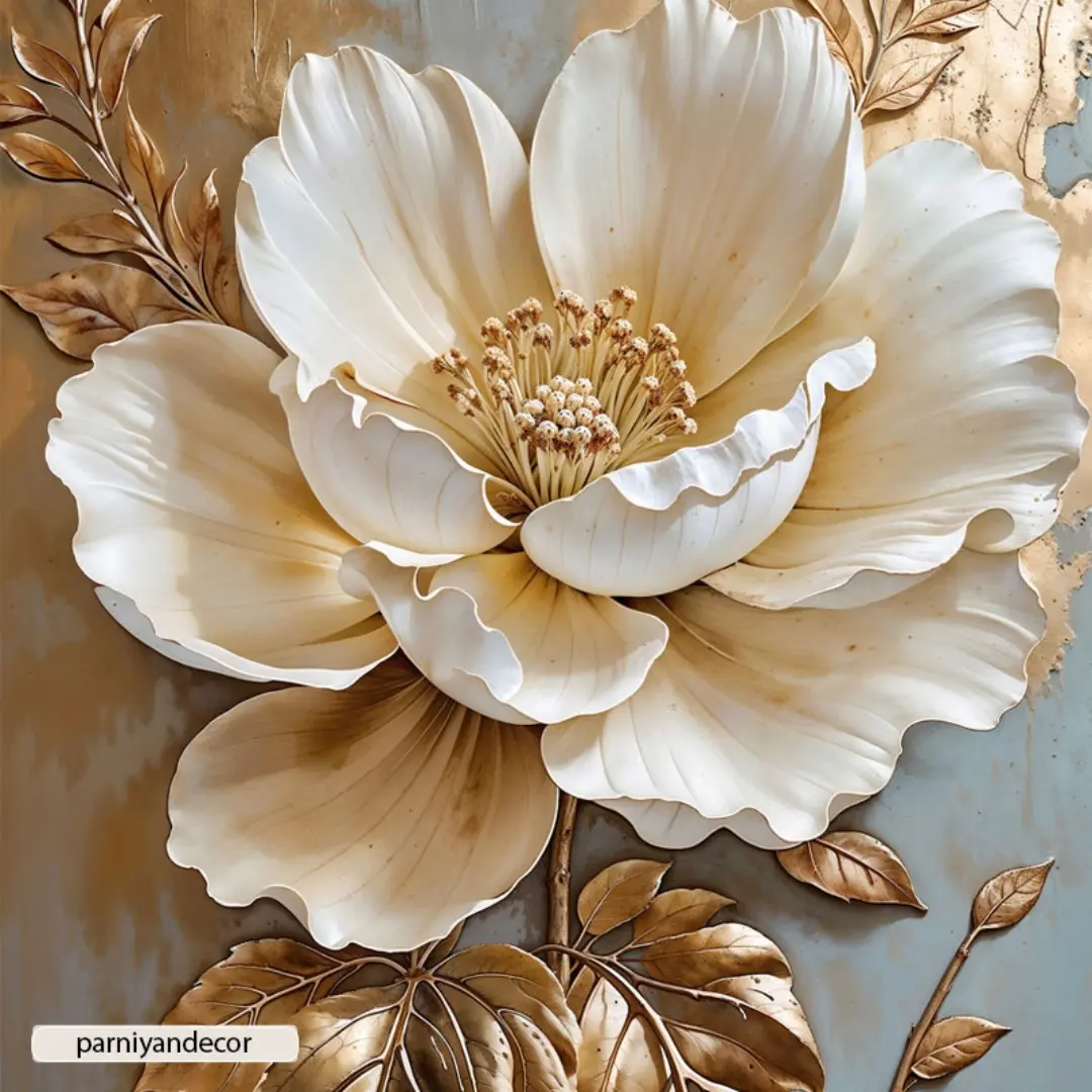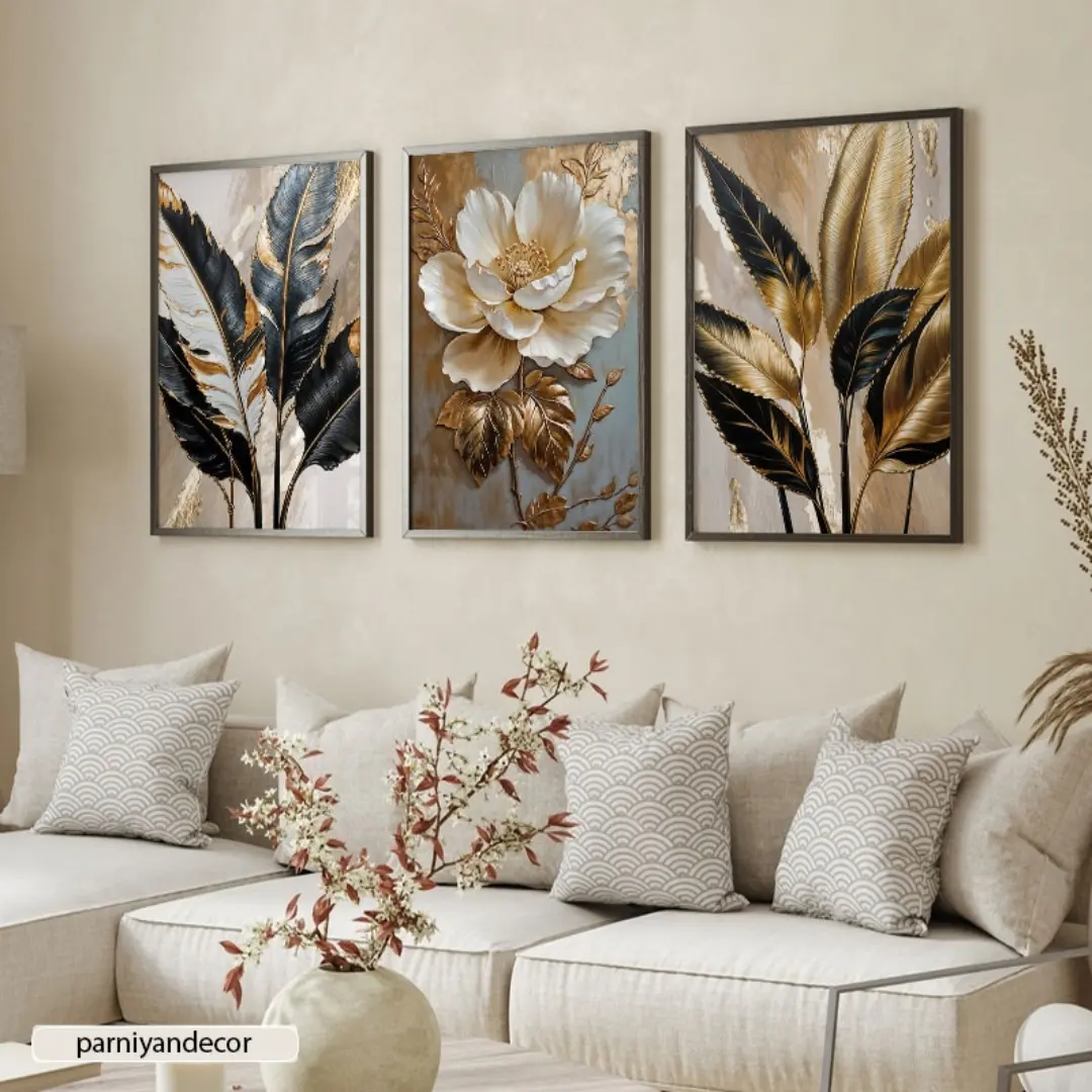 تابلو دکوراتیو ست سه تکه لوکس طلایی با طرح برگهای برجسته طلایی و گل برجسته. نوع تابلو: چاپ پارچه بوم درجه یک. قاب تابلو: چوب روسی با ضخامت ۵ سانت.