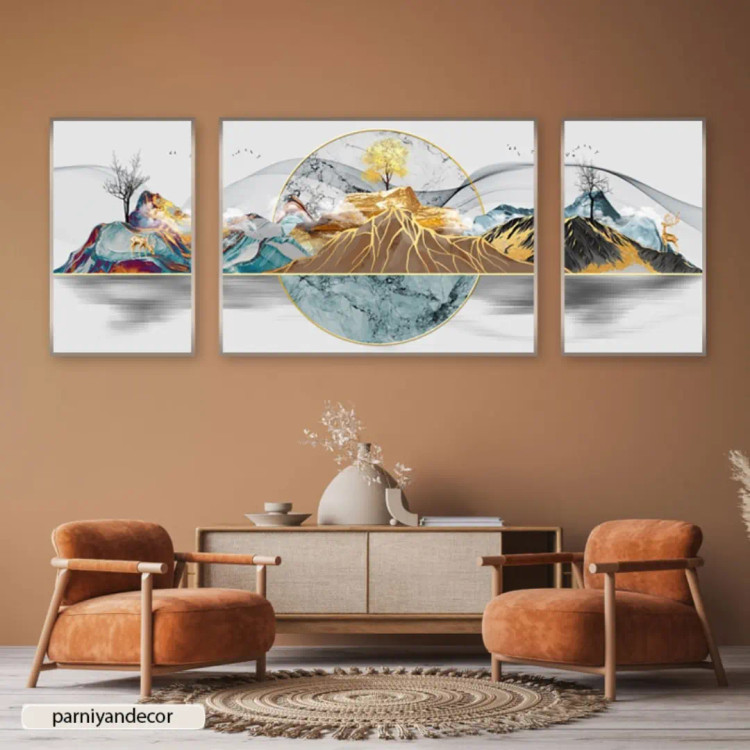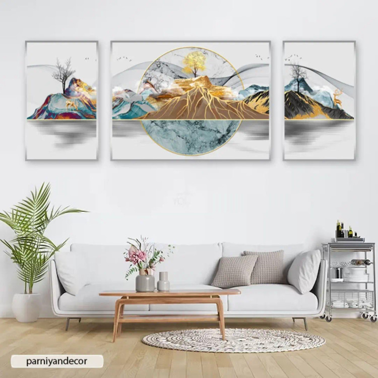 تابلو دکوراتیو ست سه تکه نامتقارن منظره با کوه‌های رنگی