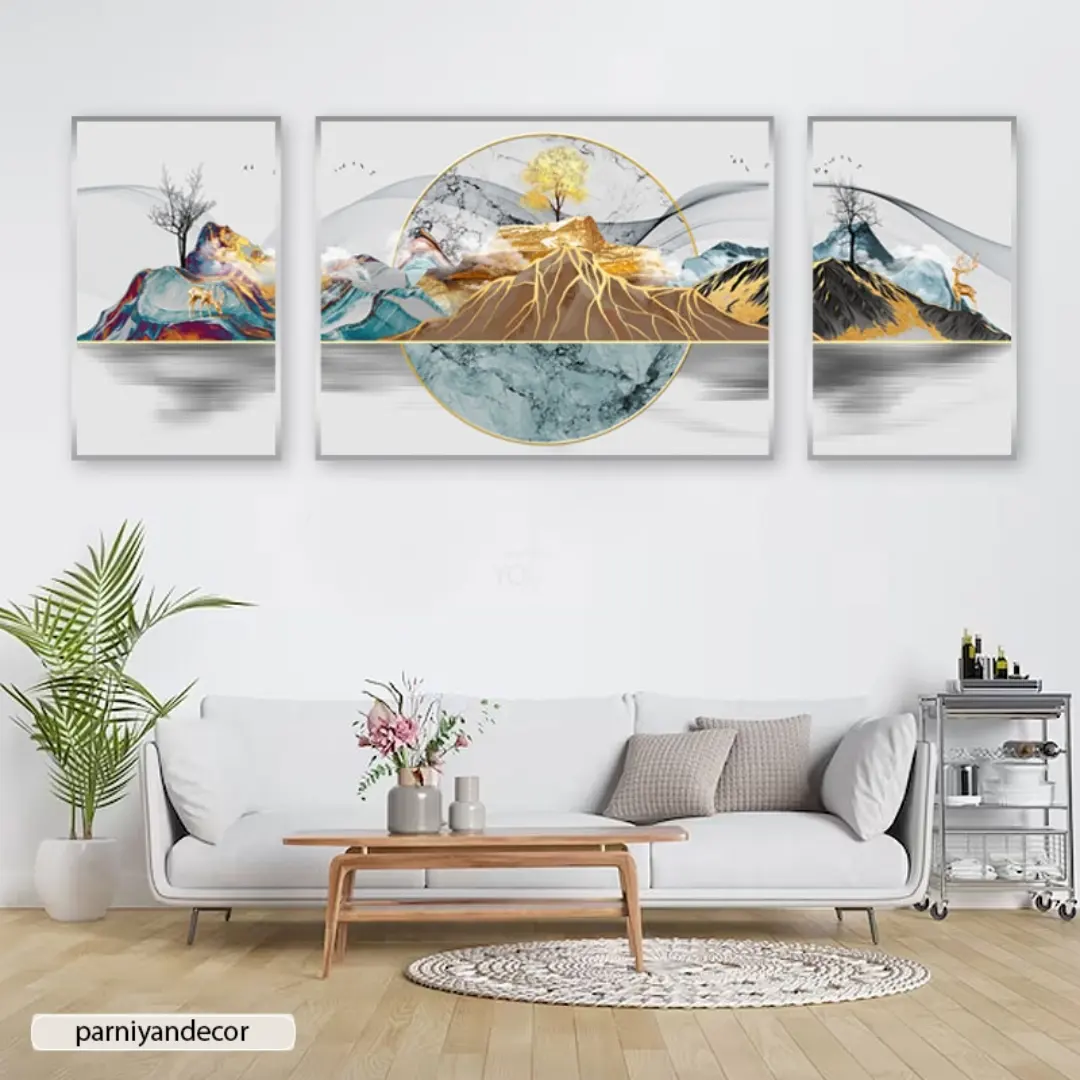 تابلو دکوراتیو ست سه تکه نامتقارن با چاپ پارچه بوم درجه یک مناسب برای دکوراسیون منزل. هدیهای ماندگار برای عزیزانتون.