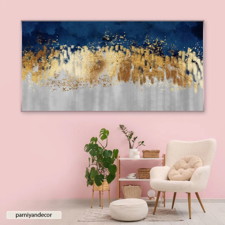 تابلو دکوراتیو افقی به سبک آبسترکت با پس زمینه آبرنگی و افکت های طلایی