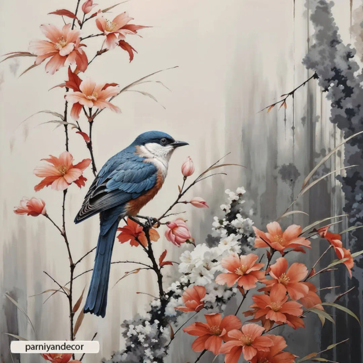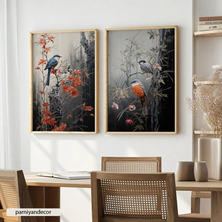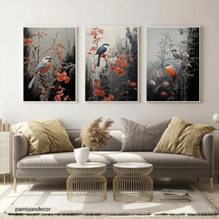 چاپ تابلو دکوراتیو ست سه تکه نقاشی دیجیتال پرنده و بلبل