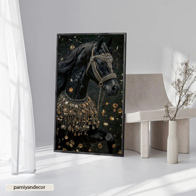 تابلو دکوراتیو عمودی با طرح اسب سیاه و افکت های طلایی، مناسب برای دکوراسیون. ابعاد تابلو ۱۰۰ در ۷۰ و ۶۰ در ۹۰ سانتیمتر.