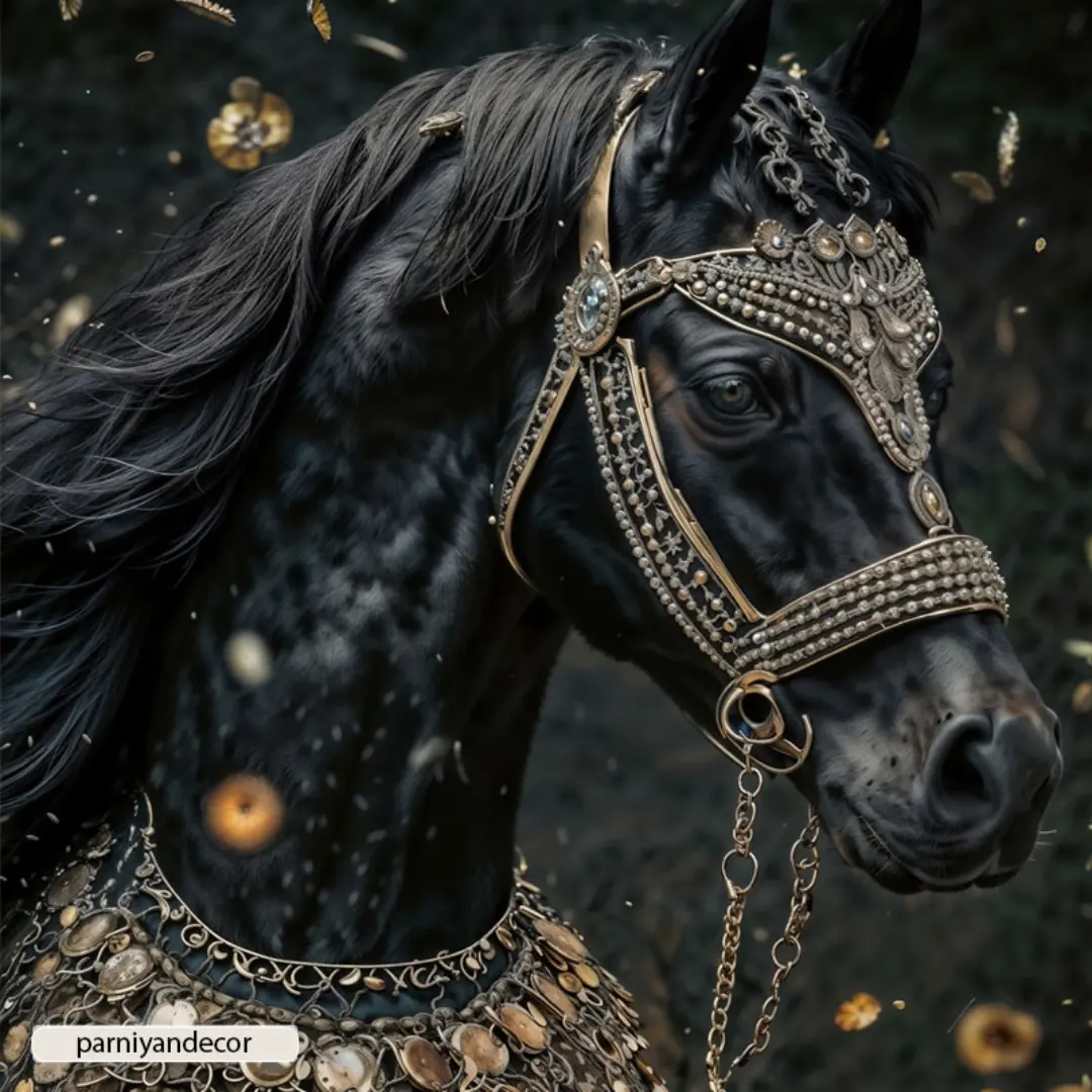 تابلو دکوراتیو عمودی لوکس طرح اسب سیاه و افکت های طلایی