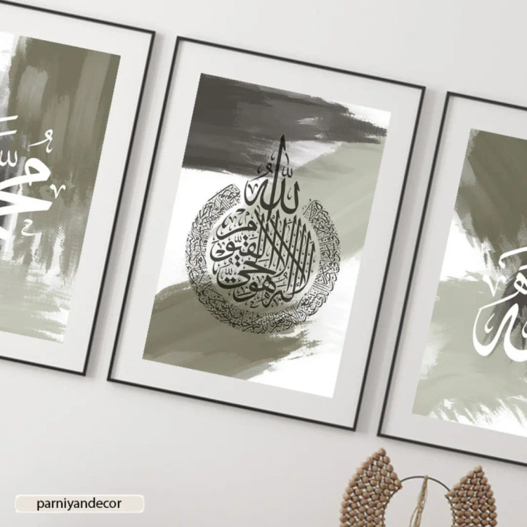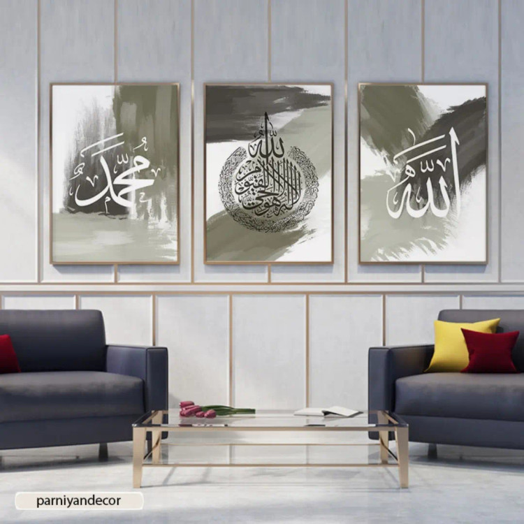 چاپ تابلو دکوراتیو ست سه تابلوی آبستره با نوشته های ثلث الله ، محمد و آیت الکرسی