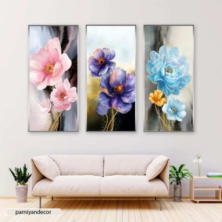 چاپ تابلو دکوراتیو ست سه تکه با طرح گل های زیبا و پس زمینه آبسترکت لوکس