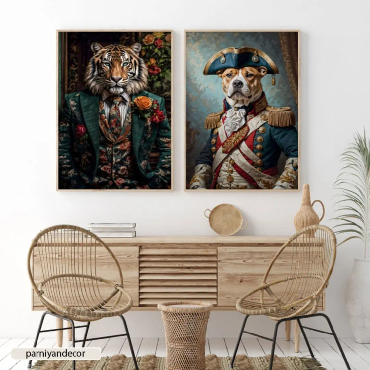 تابلو دکوراتیو ست دو تکه نقاشی دیجیتال با سبک آنتروپومورفیسم از کاراکترهای ببر جنتلمن با کت و گل و سگ با لباس ملوان دریایی