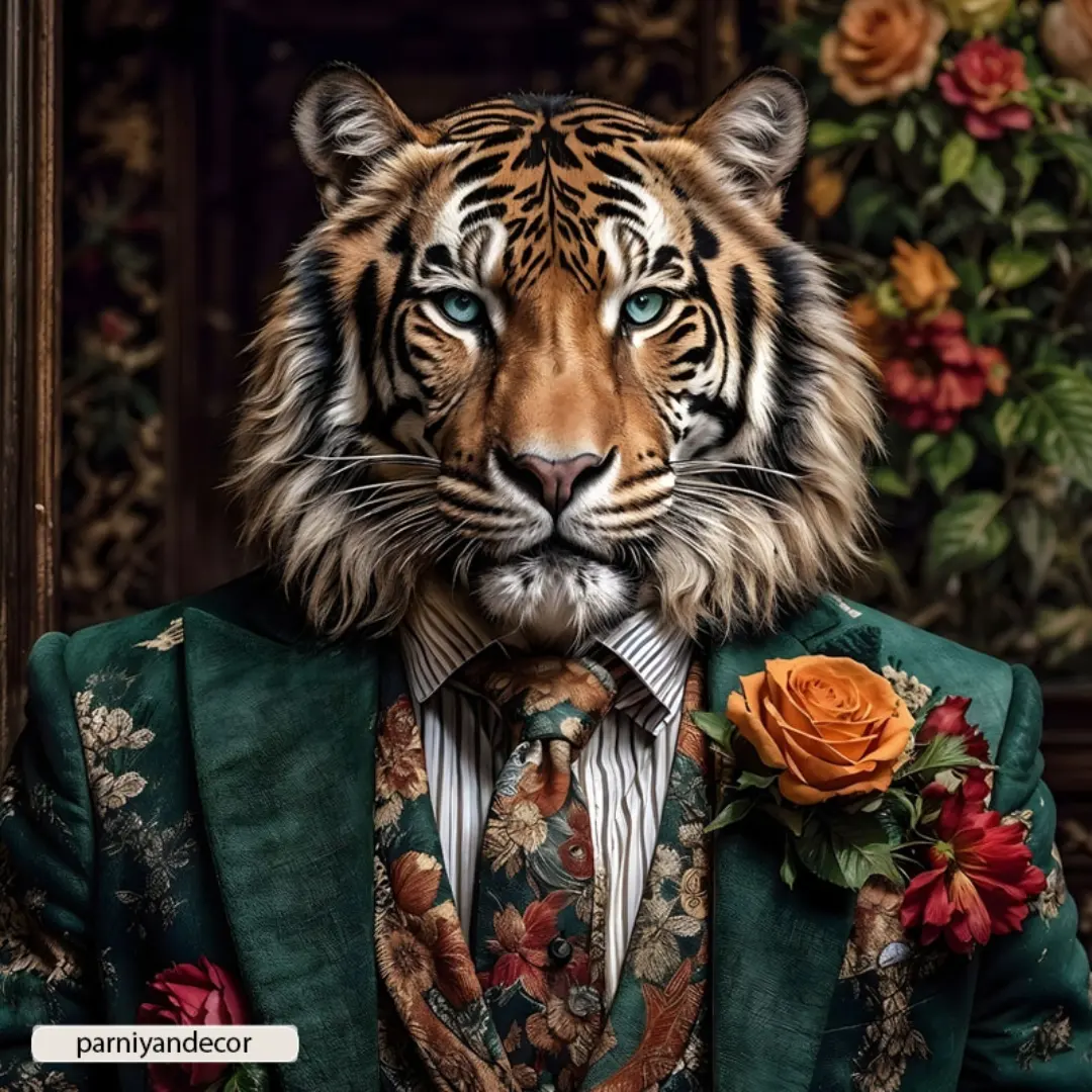 تابلو دکوراتیو ست دو تکه نقاشی دیجیتال با سبک آنتروپومورفیسم از کاراکترهای ببر جنتلمن با کت و گل و سگ با لباس ملوان دریایی