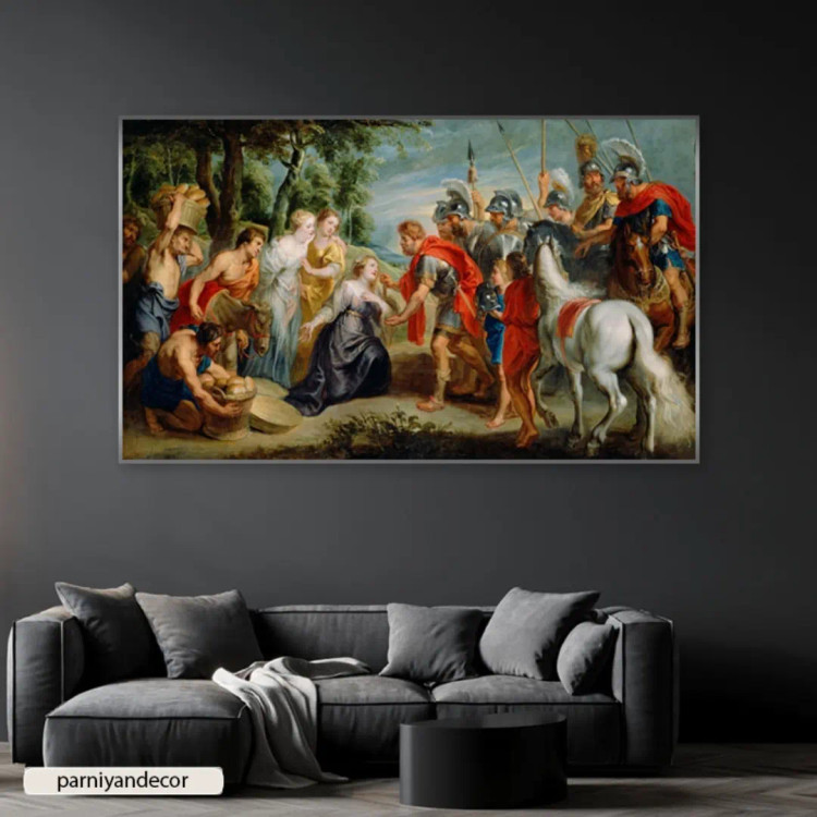 تابلو دکوراتیو افقی با طرح نقاشی "David Meeting Abigail" اثری از پیتر پل روبنس. نقاشی بر اساس داستانی از عهد عتیق با ابعاد ۱۶۰ در ۹۰، نوع چاپ پارچه بوم درجه یک و قاب چوب روسی با ضخامت ۵ سانت.