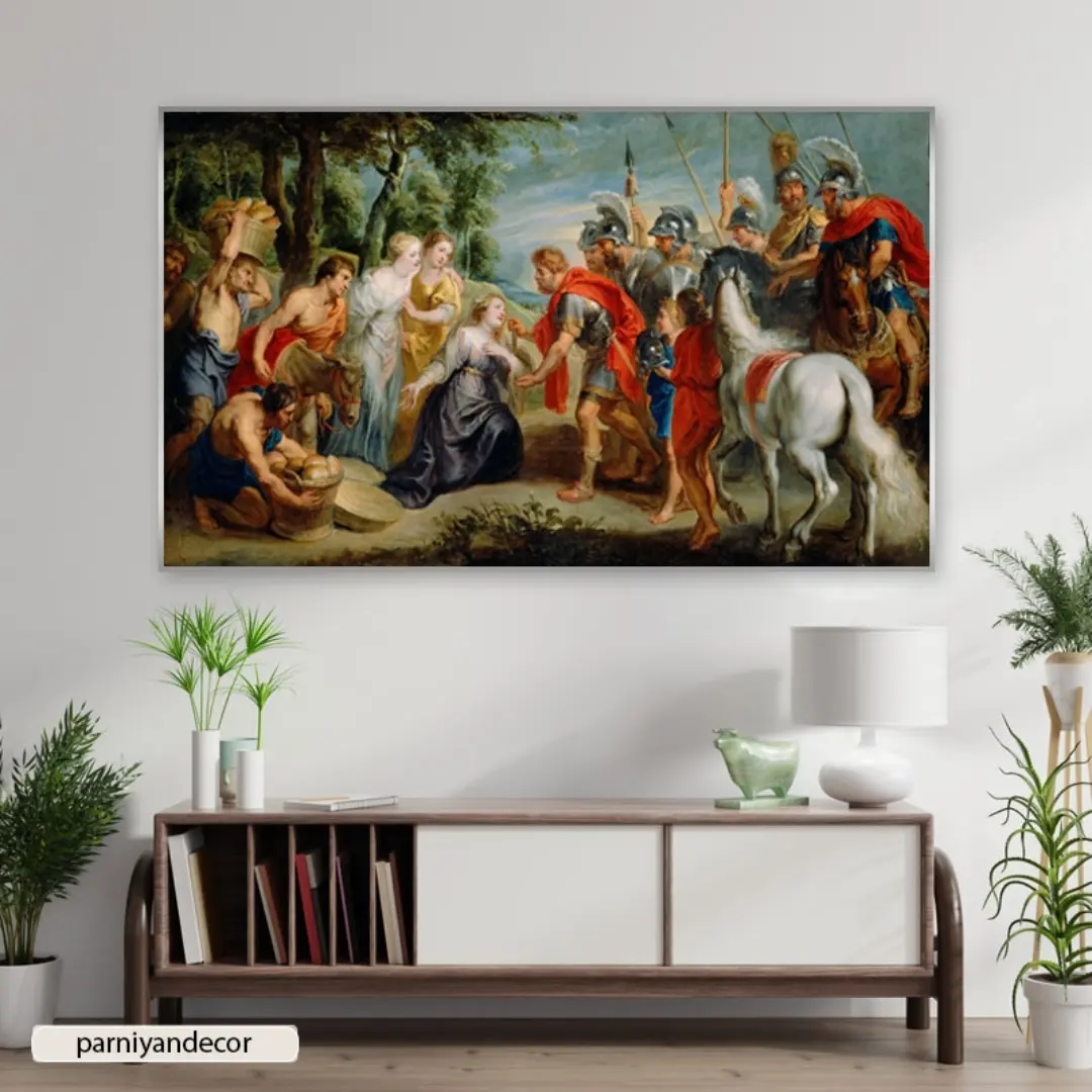 تابلو دکوراتیو افقی با طرح نقاشی "David Meeting Abigail" اثری از پیتر پل روبنس. نقاشی بر اساس داستانی از عهد عتیق با ابعاد ۱۶۰ در ۹۰، نوع چاپ پارچه بوم درجه یک و قاب چوب روسی با ضخامت ۵ سانت.